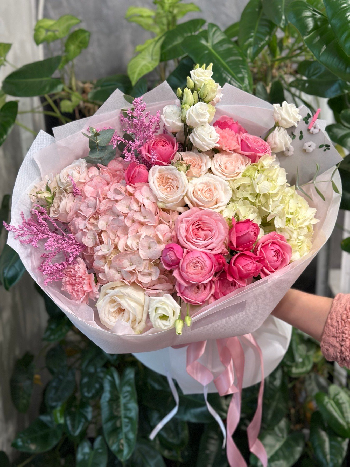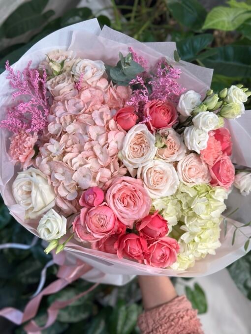 | Склад: | Гортензія, піоноподібні троянди, кущова троянда двох сортів, еустоми, солідаго фарбоване, гвоздики, пакування |