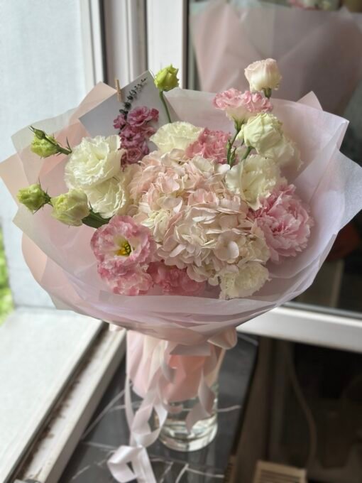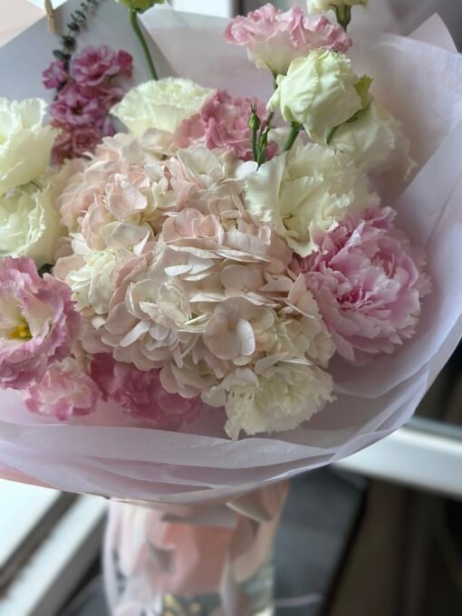 | Склад: | Гортензія, півонія, кучеряві еустоми, упакування. |