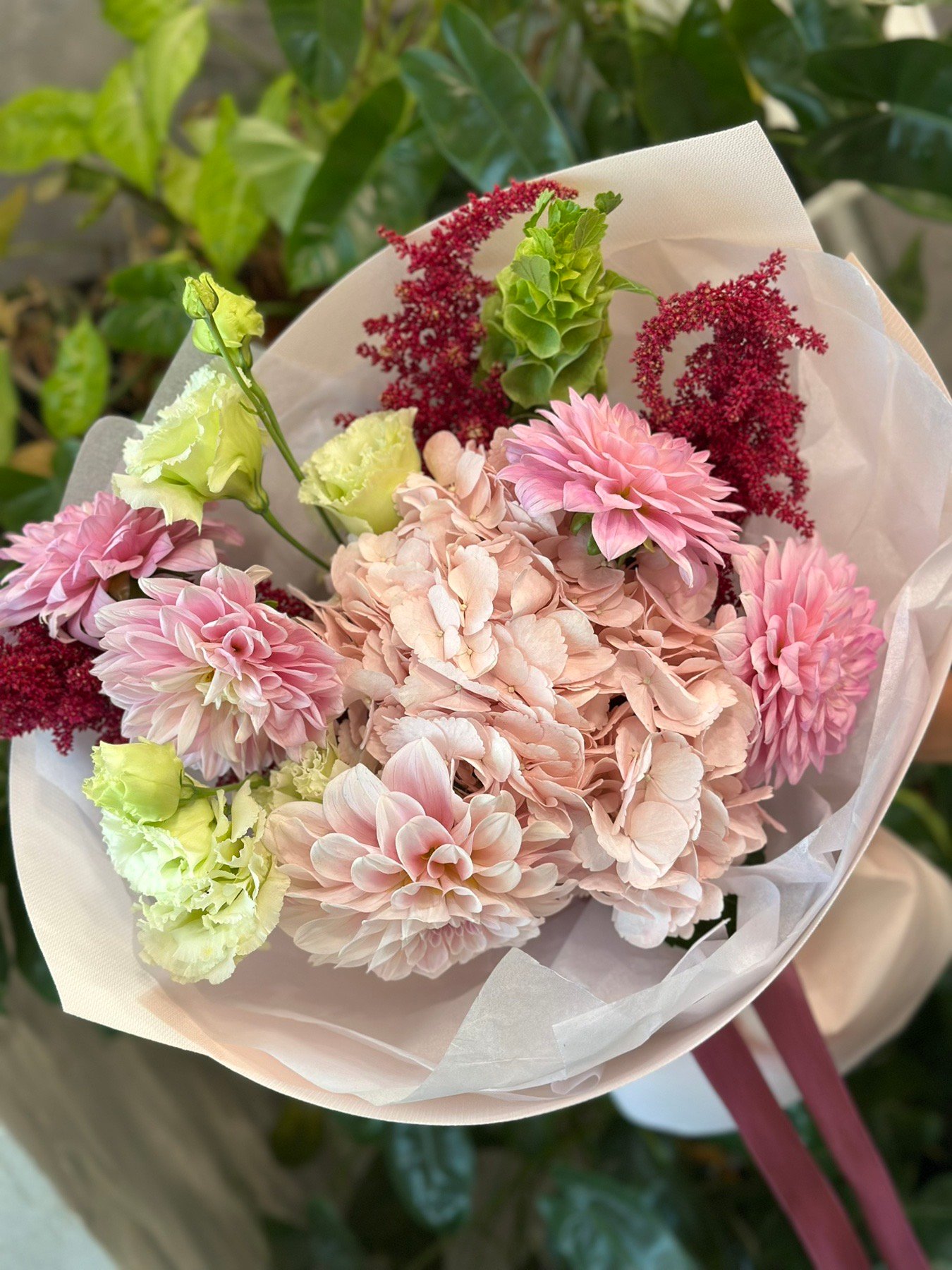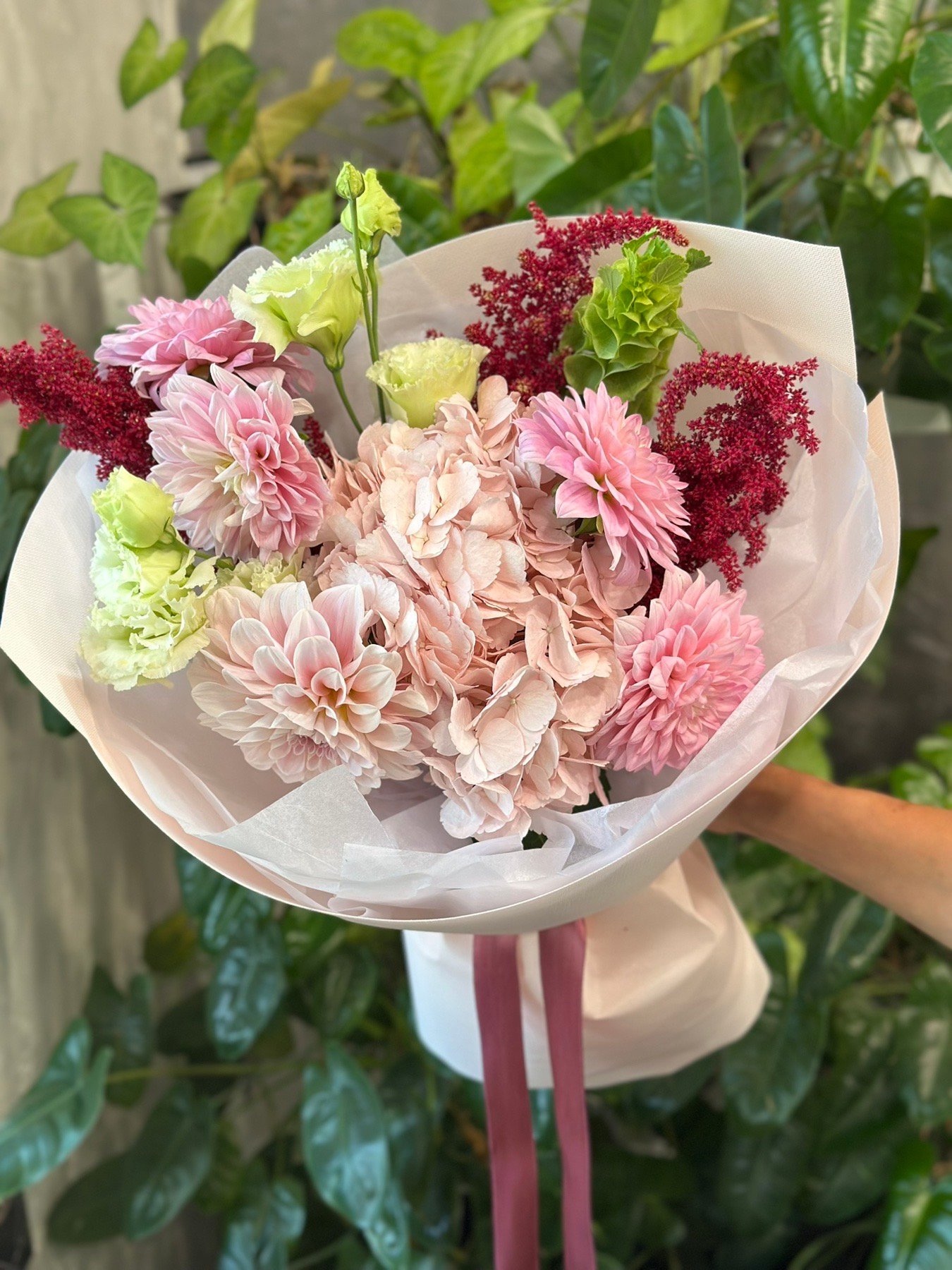 | Склад: | Гортензія, жоржини, амарант, молюцелла, кучеряві еустоми, пакування |