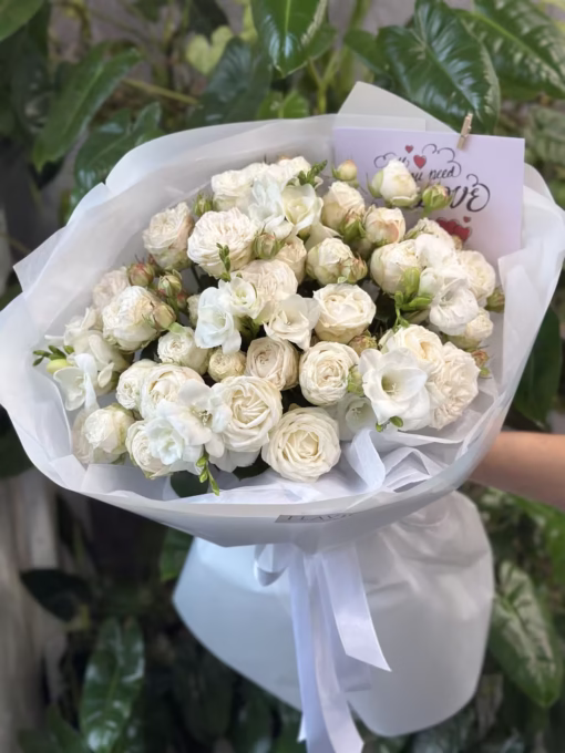 | Склад: | Кущова троянда Бомбастік 10 шт, фрезії -6 шт, пакування. |