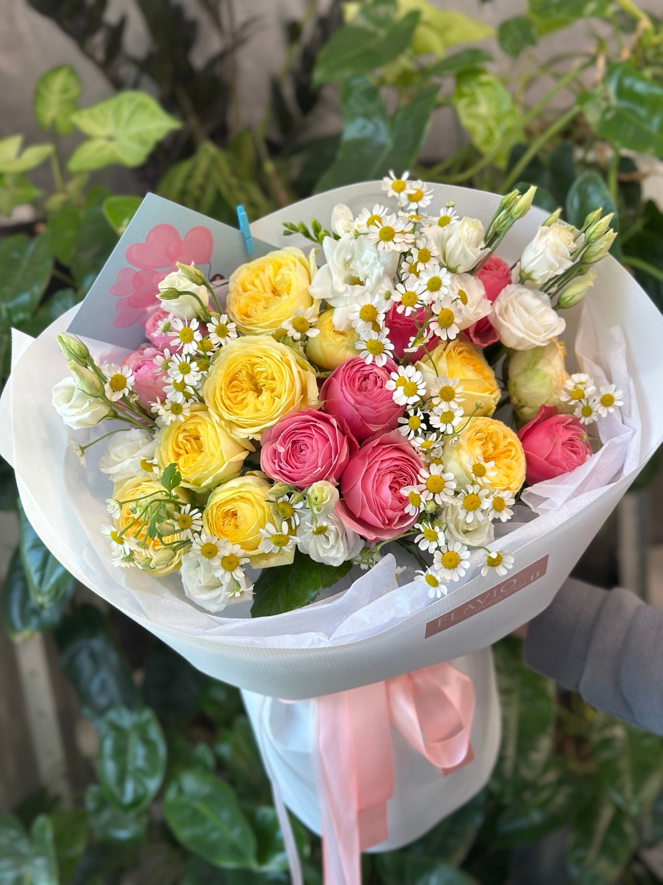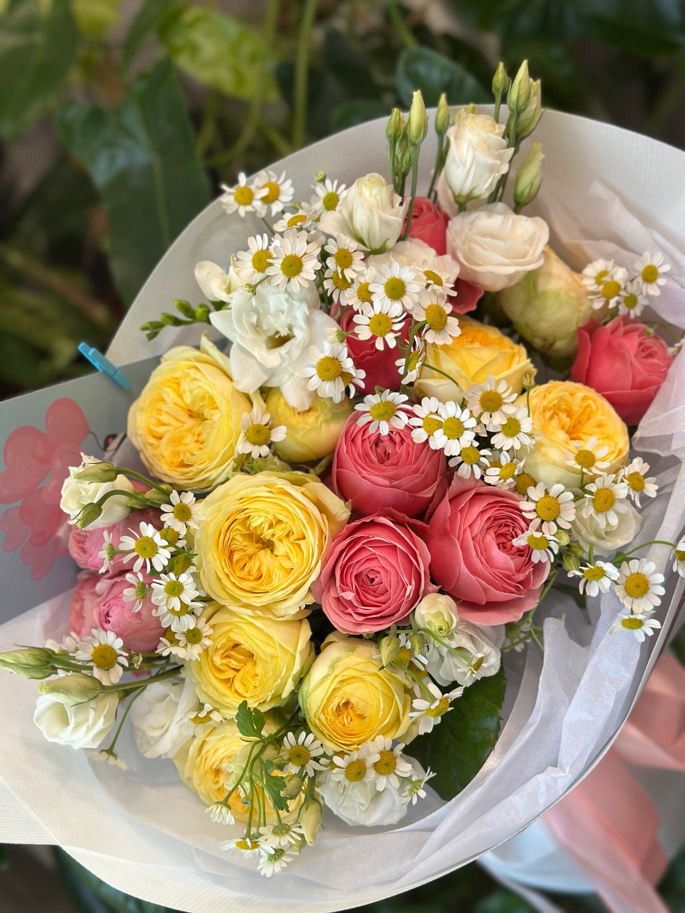 | Склад: | Кущові піоноподібні троянди Піоні Баблс та Сільва пінк, еустоми, польові ромашки, пакування |