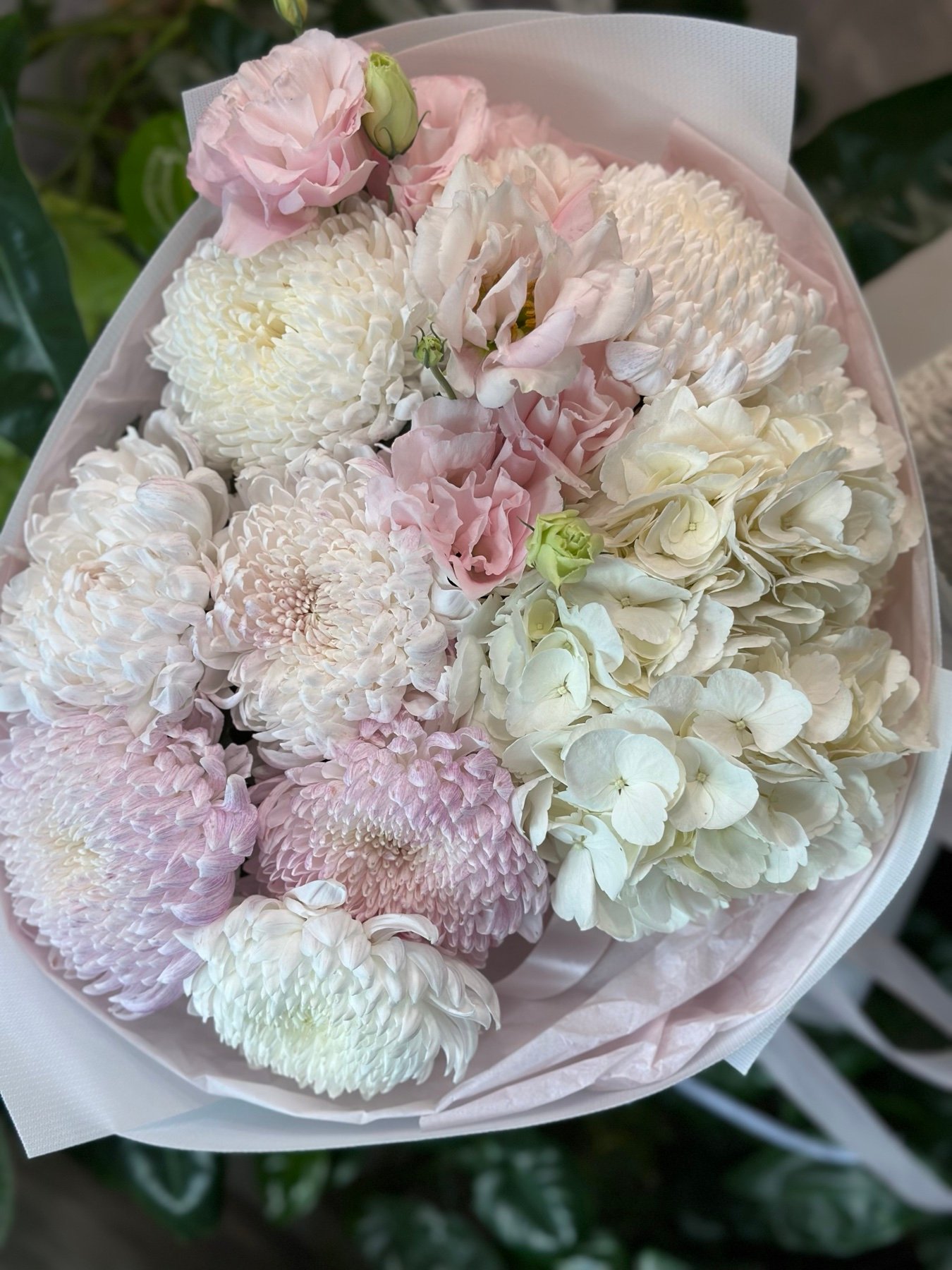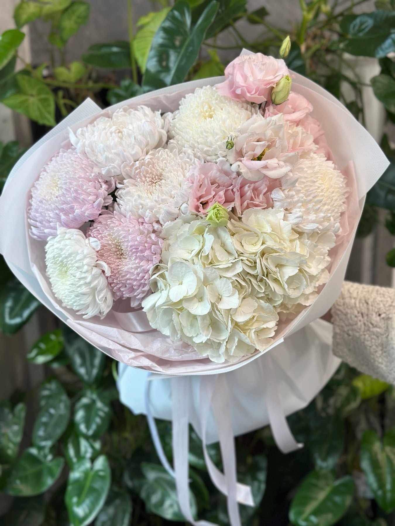| Склад: | Гортензія, хризантеми Голова, еустома, пакування |
