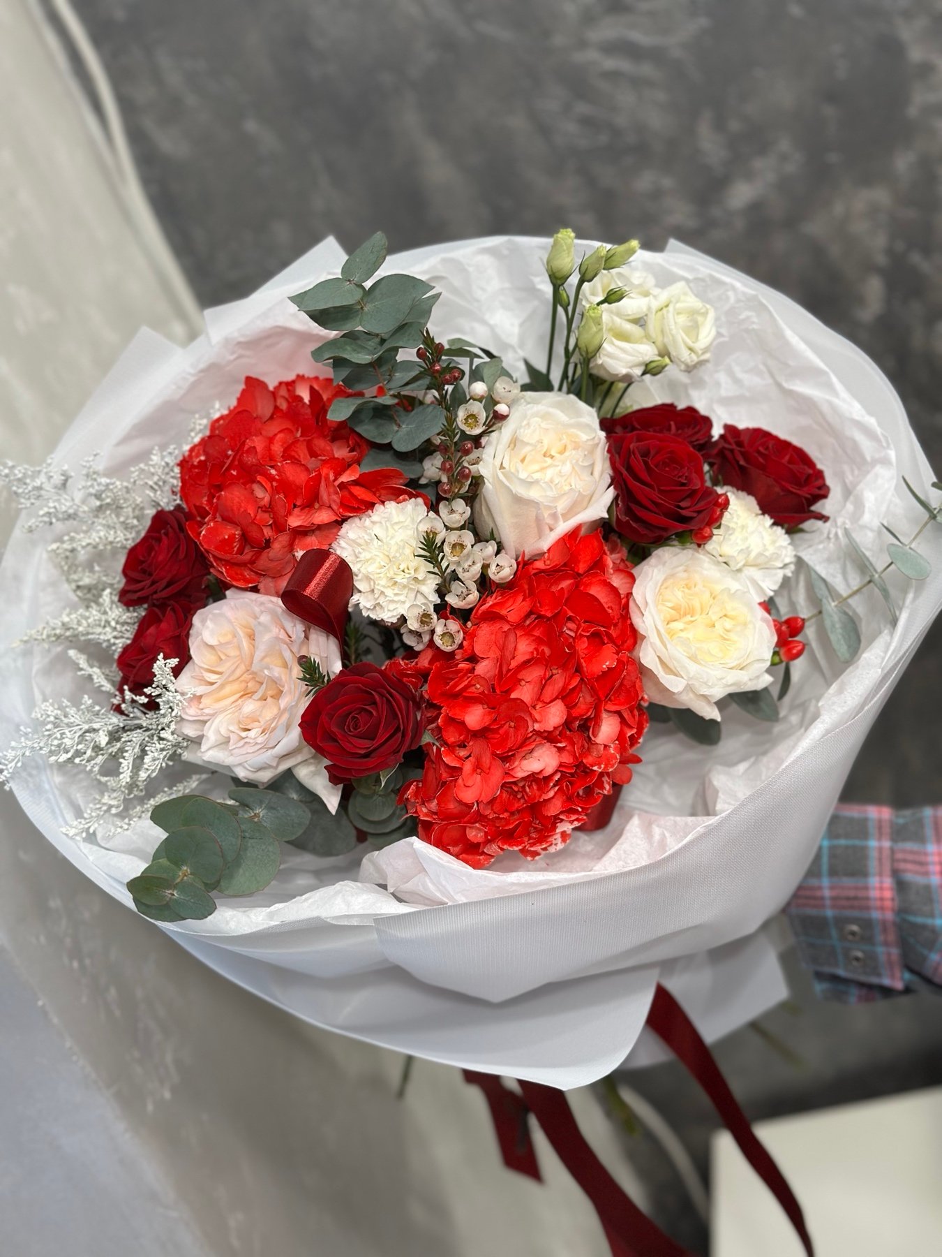 | Склад: | Гортензія, Діантус білий, О Хара, Хамеляціум, Хаперикум, Еустома, Солідаго фарбоване, Кущова троянда, евкаліпт, пакування. |