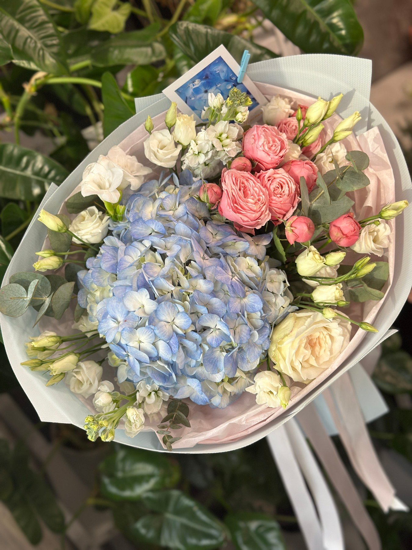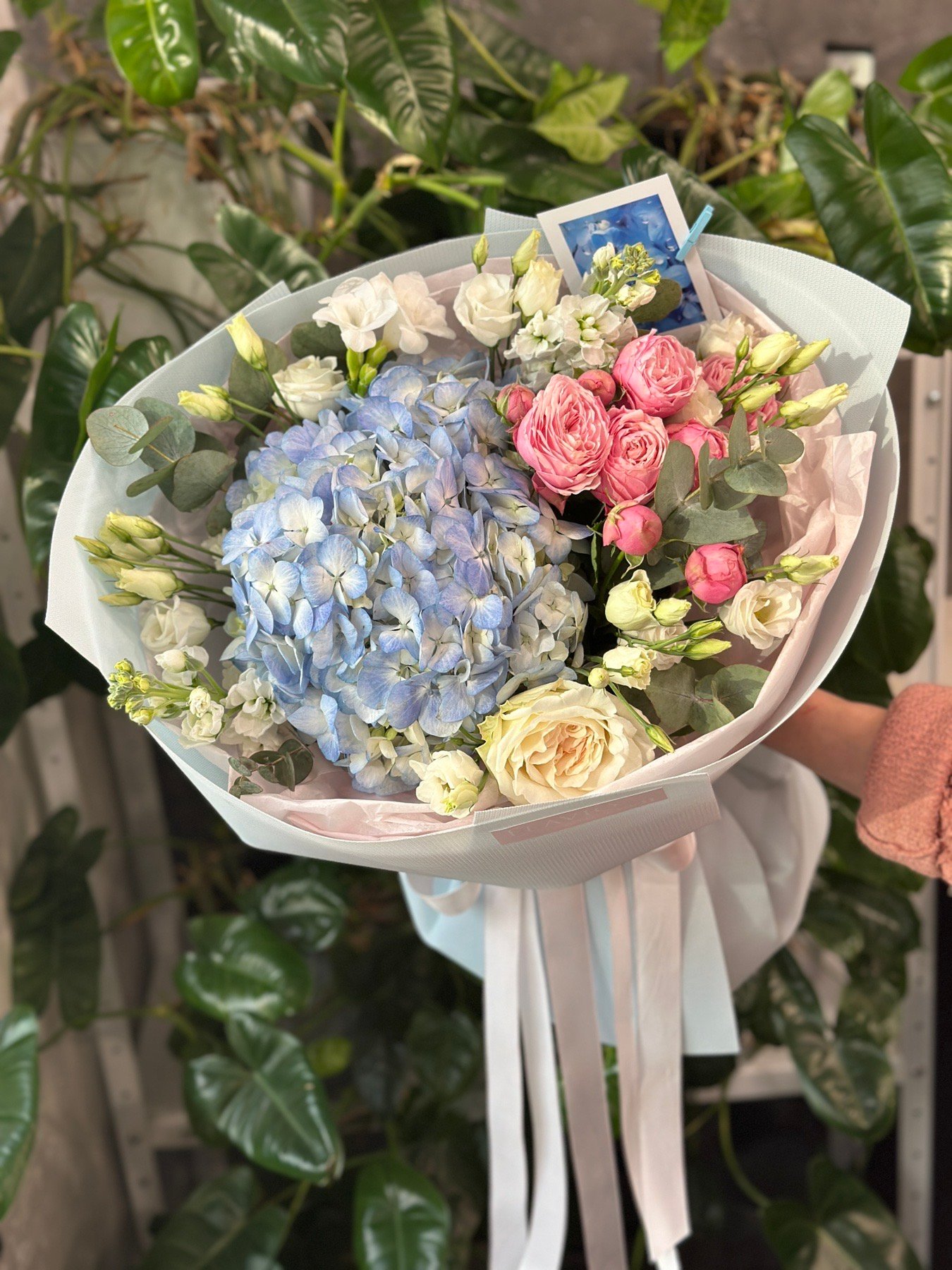 | Склад: | Гортензії, кущові піоноподібні троянда, троянда, фрезія, матіола, евкаліпт , упакування. |