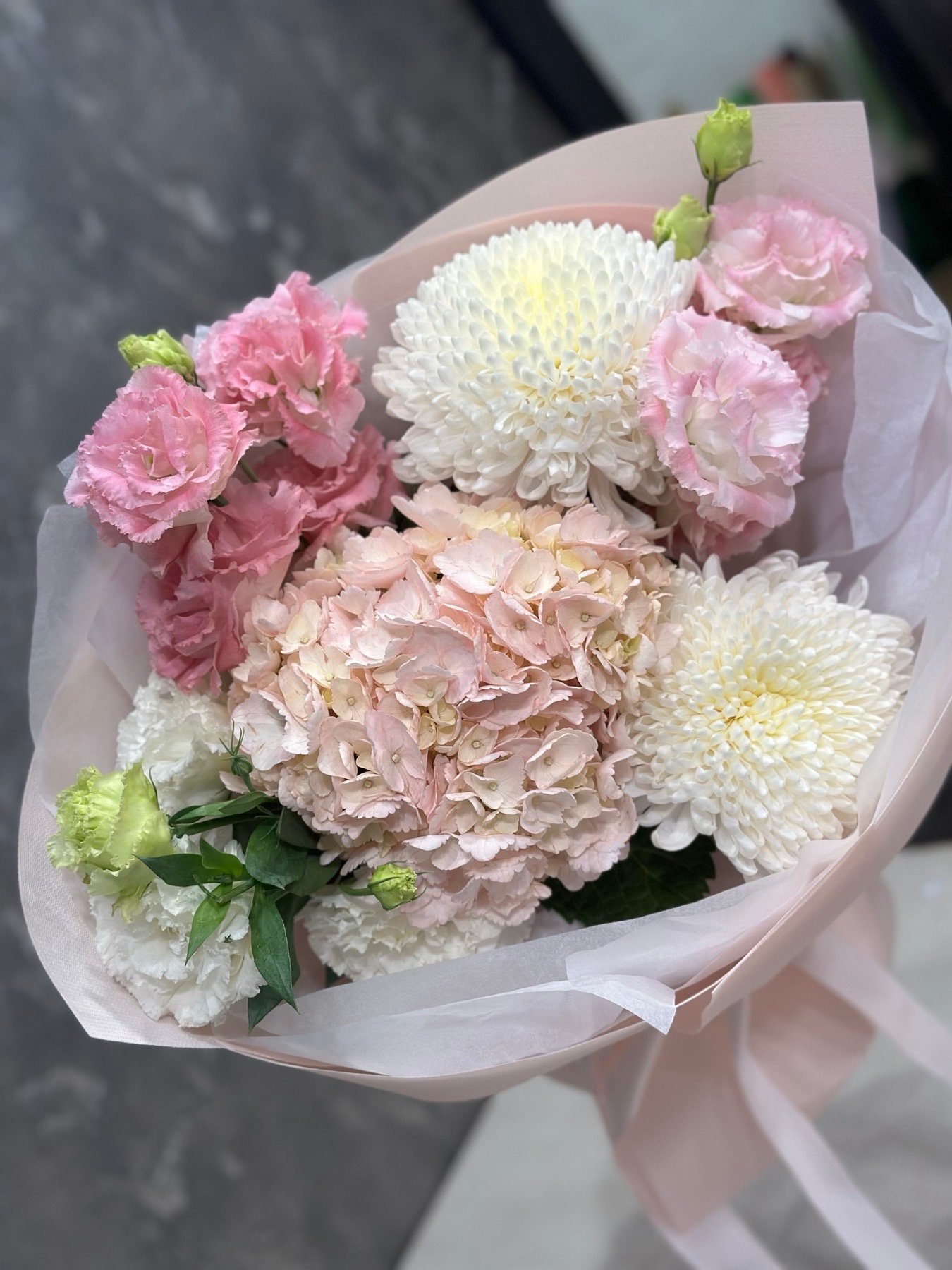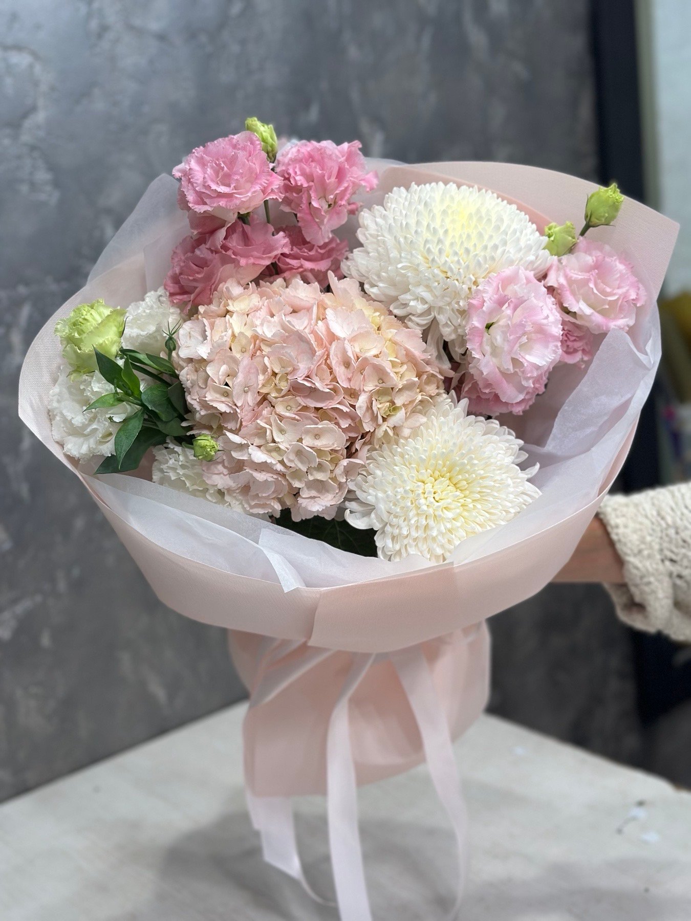 Склад: | гортензія, кучеряві еустоми, хризантема Міла, пакування. |