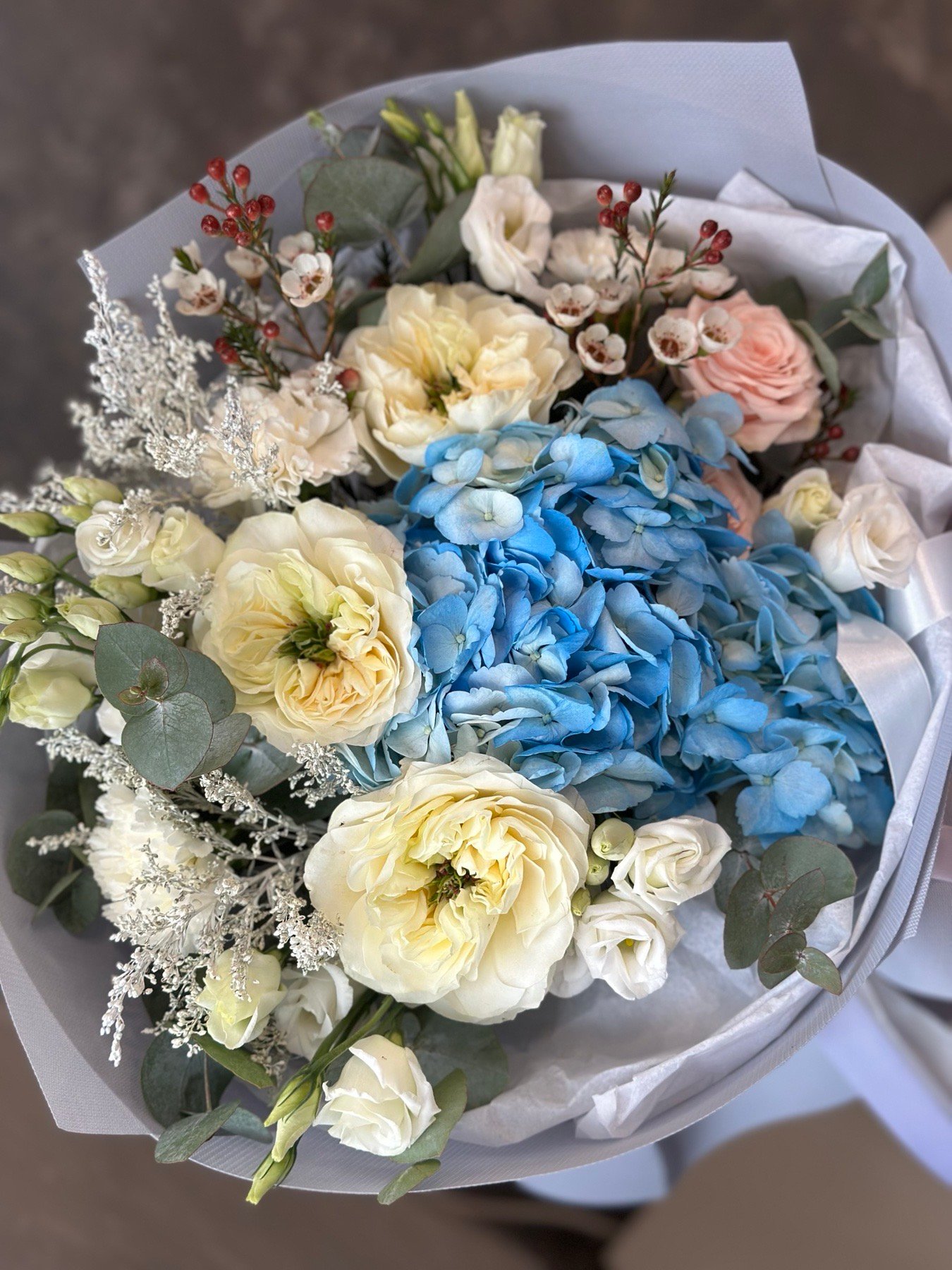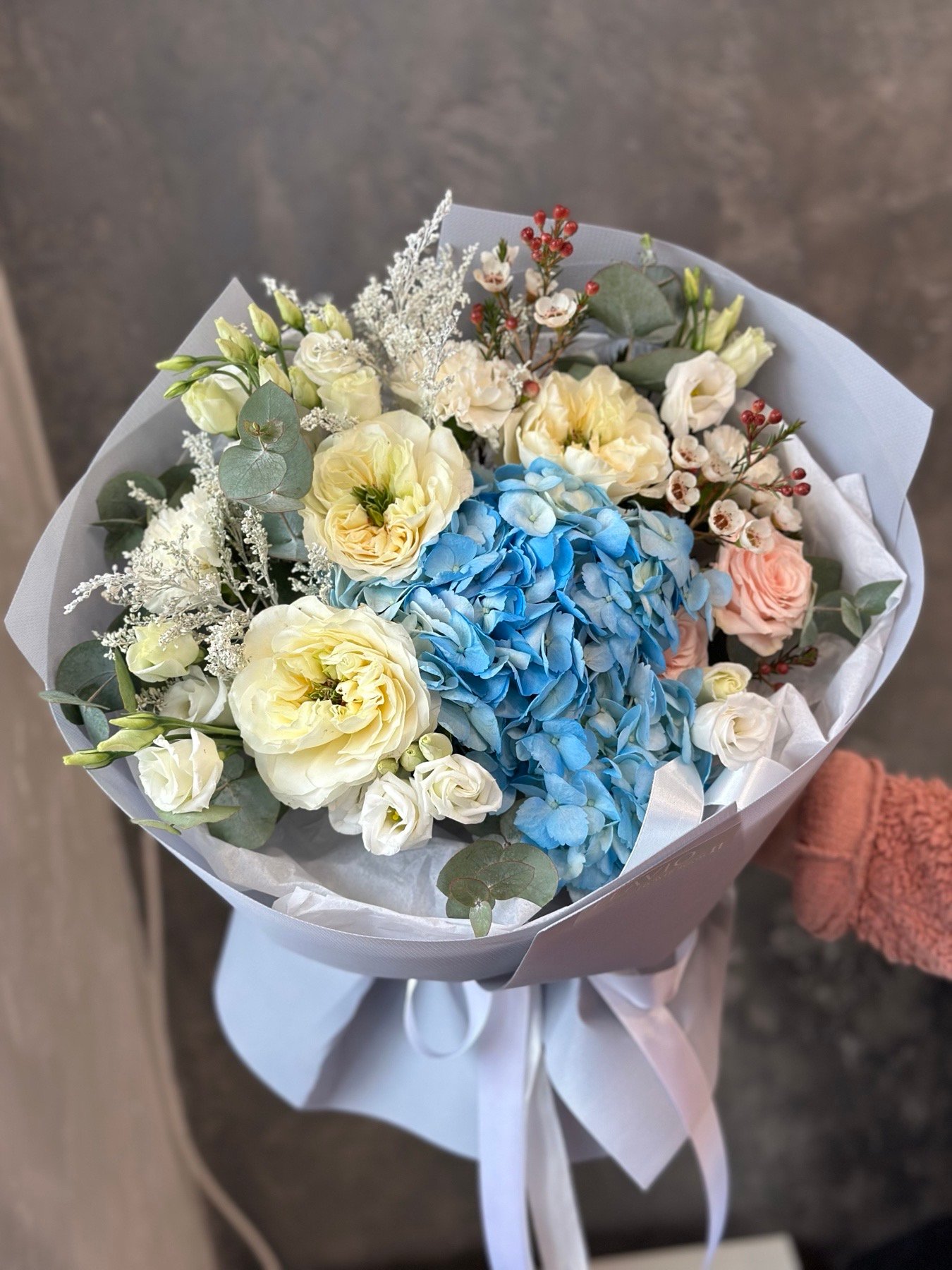 | Склад: | Гортензія, піоноподібні троянди, еустома, хамеляціум, гвоздики, кущова троянда, фарбоване солідаго, евкаліпт , пакування |