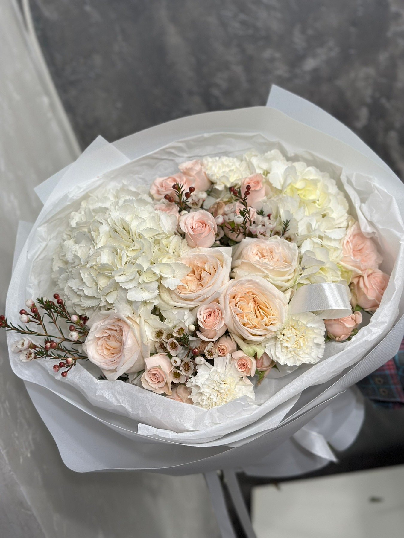 | Склад: | Гортензії, кущові троянди, піоноподібні троянди ОХара, гвоздики, хамеляціум, пакування |