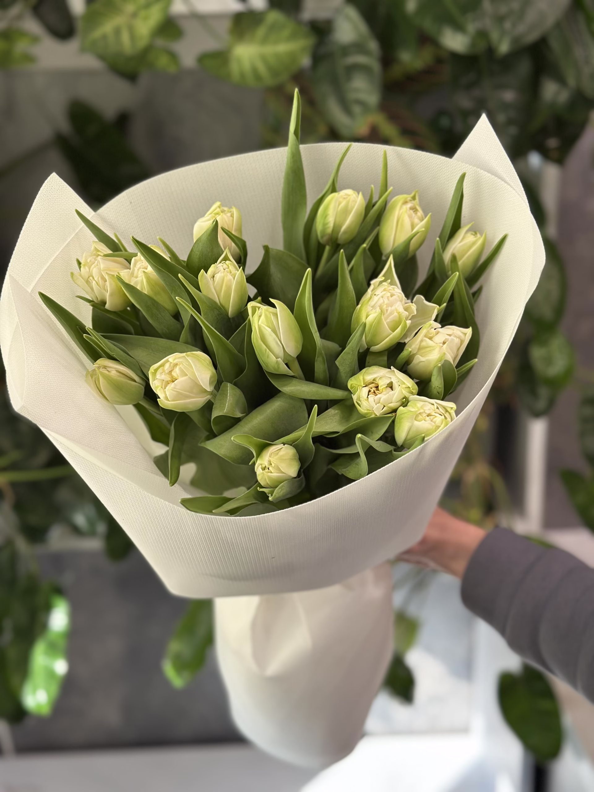 Букет з 15 білих піоноподібних тюльпанів “Northcap”