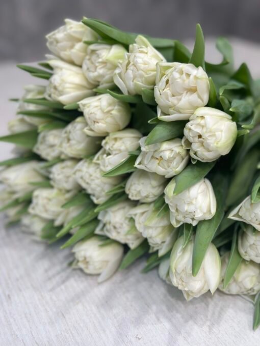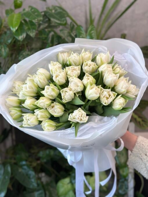 Букет з 35 або 45 білих піоноподібних тюльпанів “The Edge”