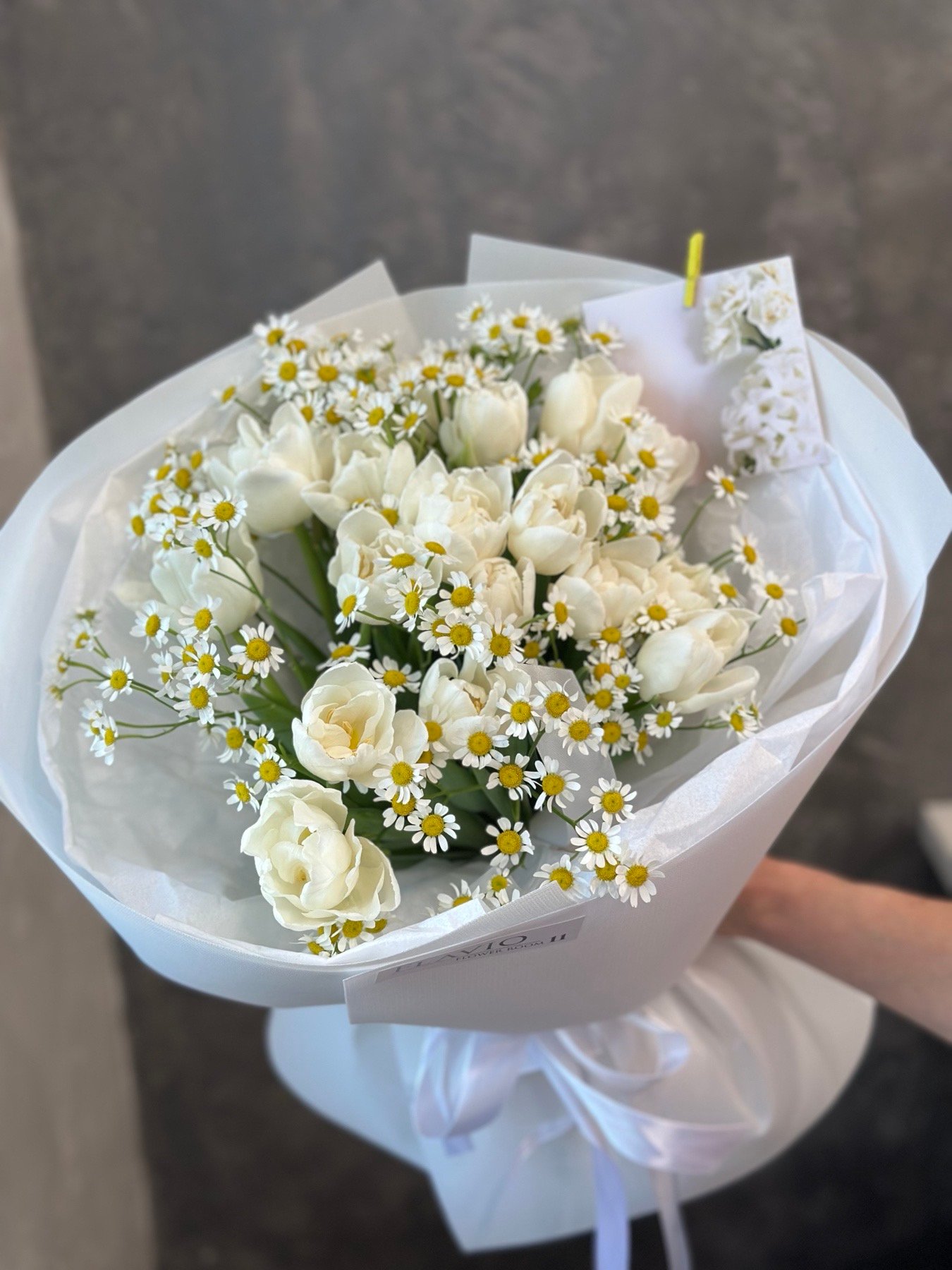 Букет з білих тюльпанів та ромашок