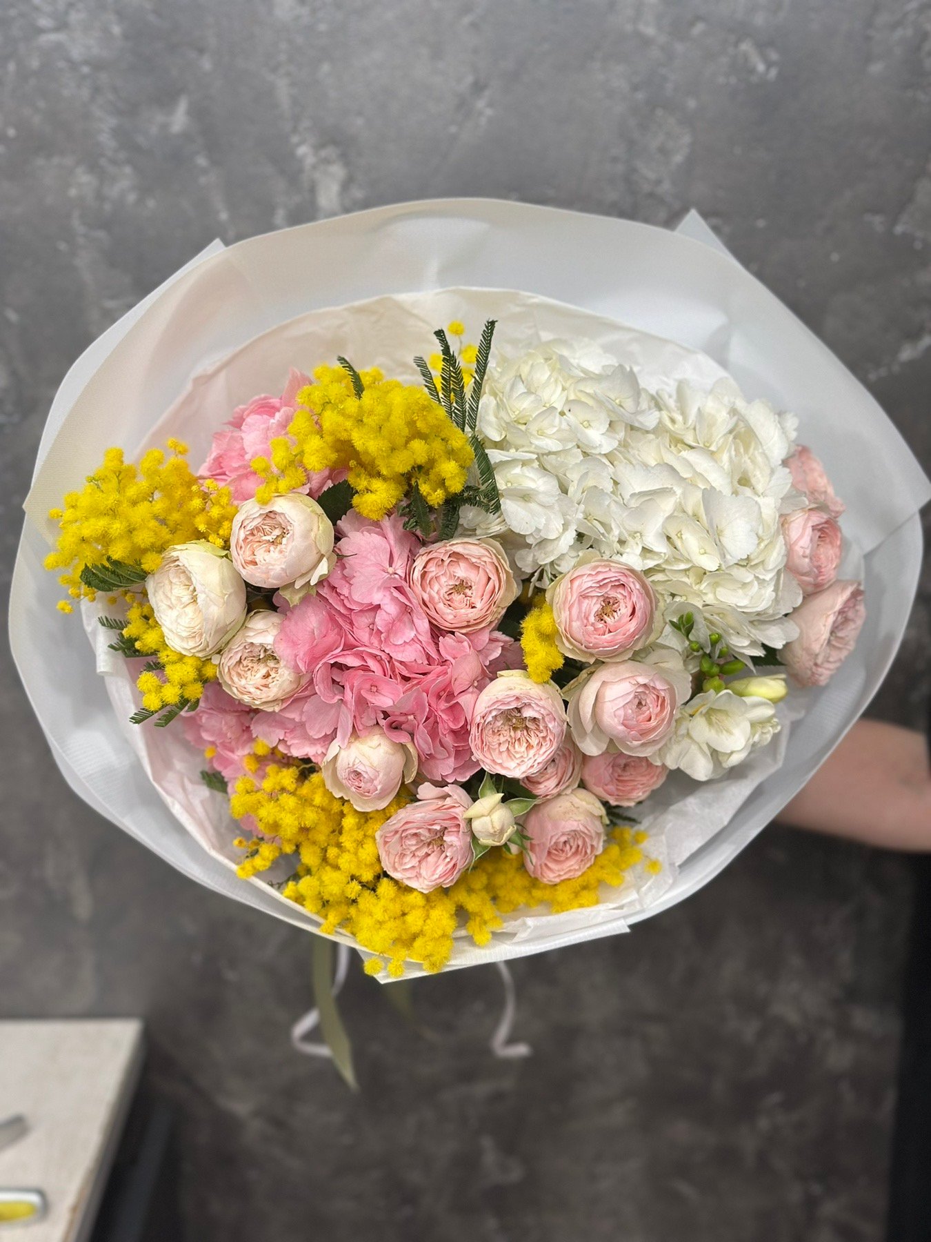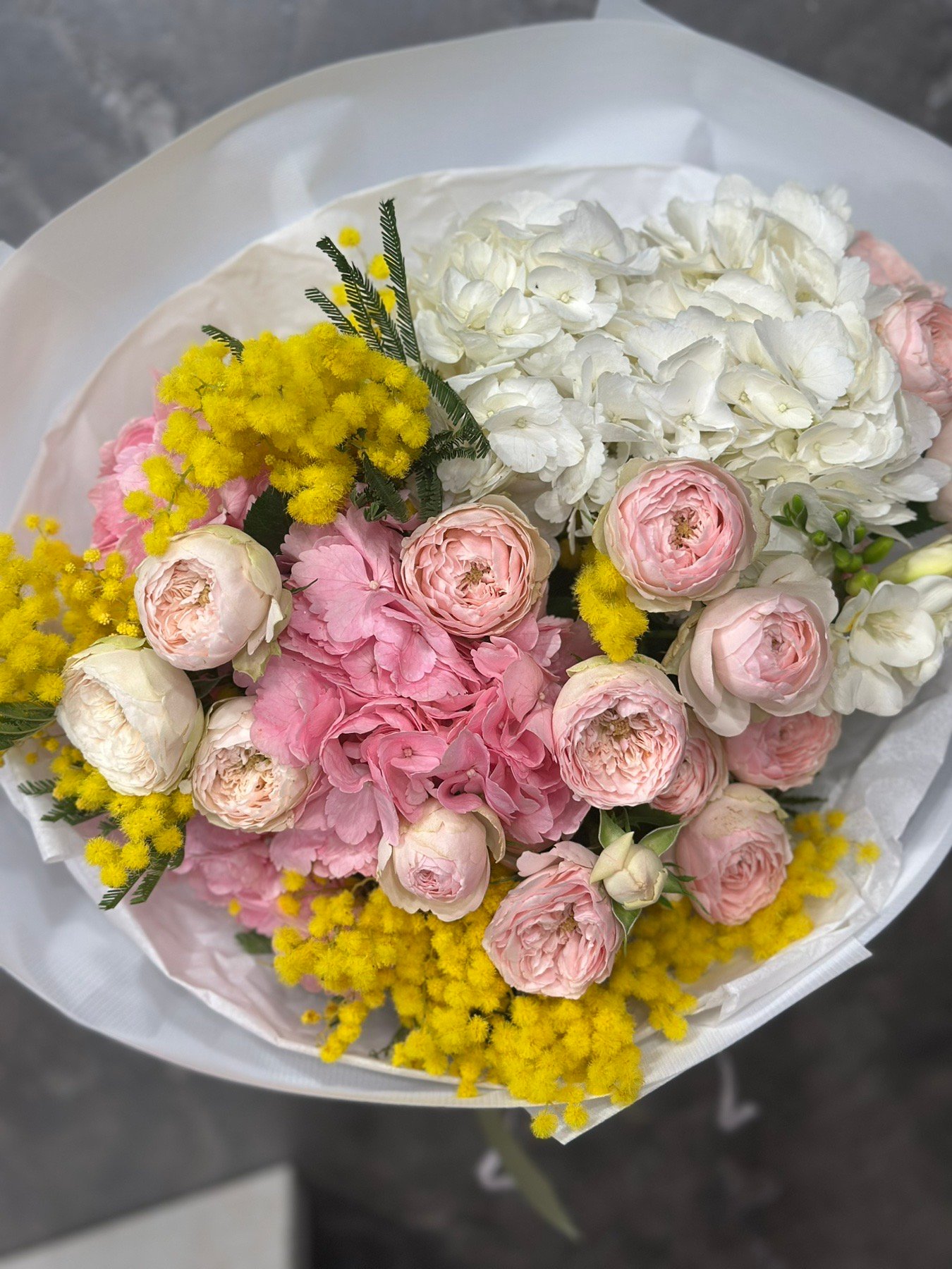 Букет з гортензіями, кущовими піоноподібними трояндами та мімозою #117