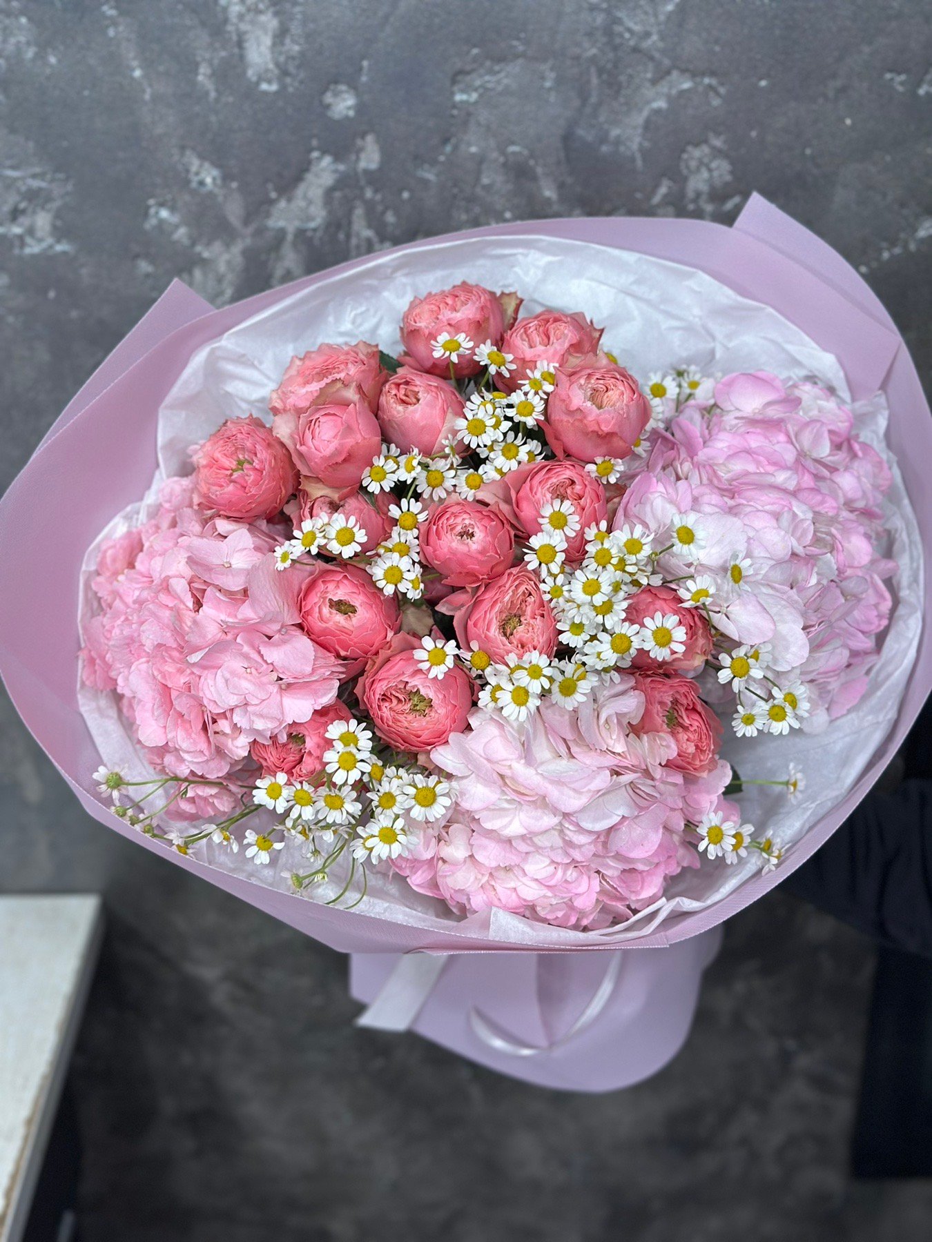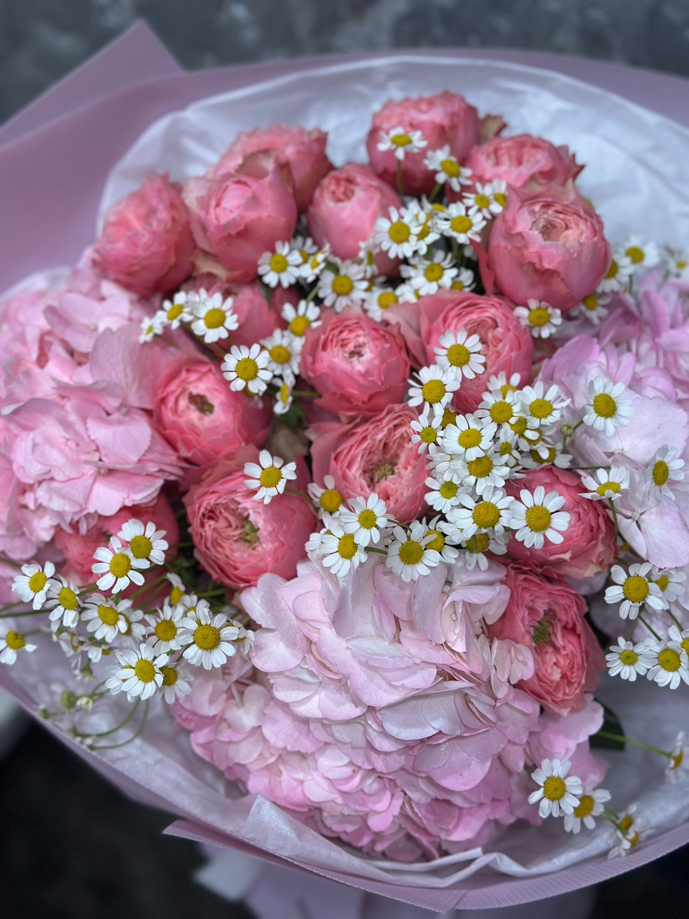 Букет з гортензіями, кущовими піоноподібними трояндами та ромашками # 124