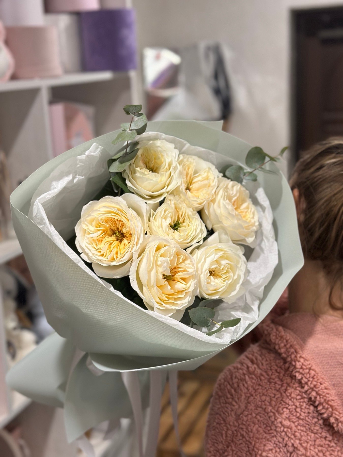 Букет з піоноподібних троянд “Vicky Gardens” та евкаліпту