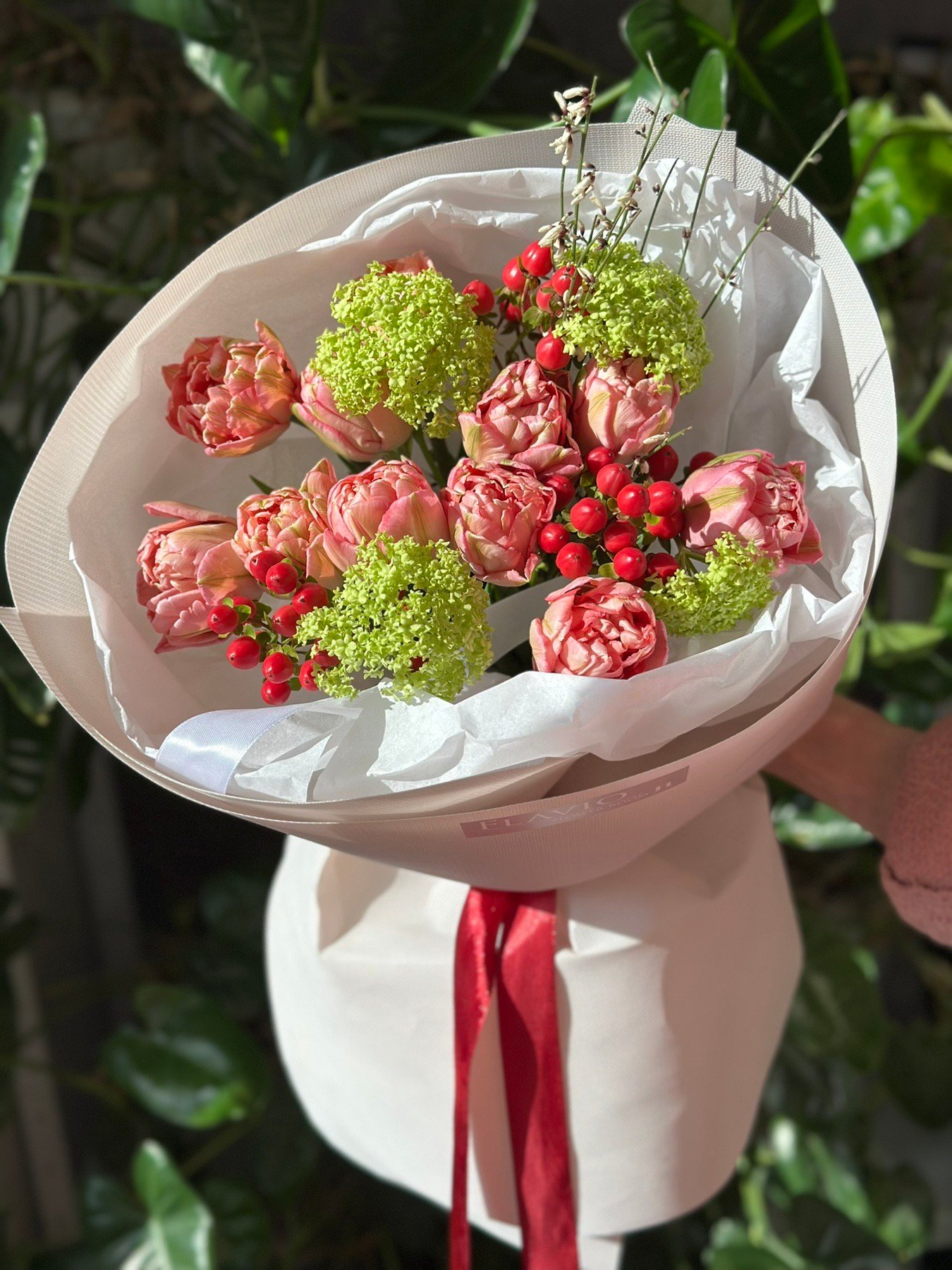 Букет з піоноподібними тюльпанами, хіперікумом та вібурнум #127