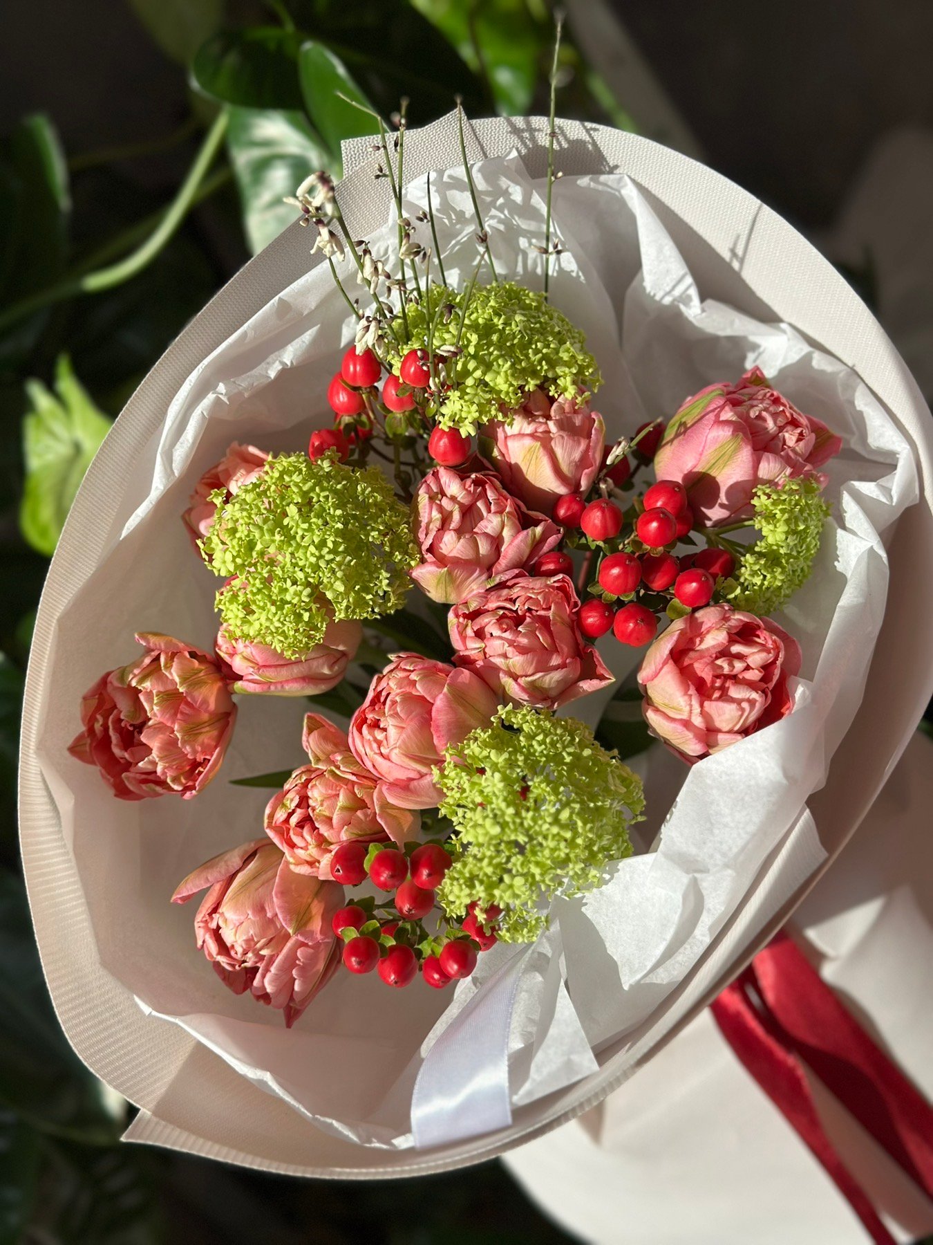 | Склад: | Тюльпани піоноподібні, хіперікум, вібурнум, упакування. |