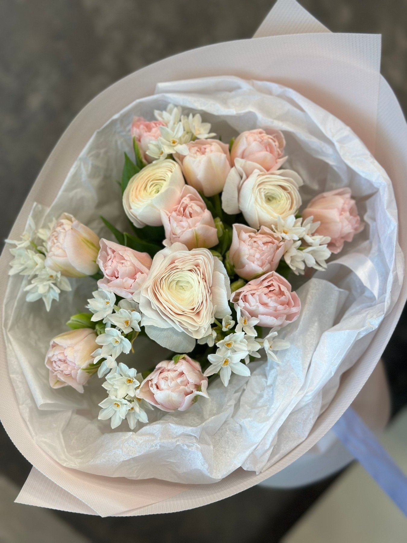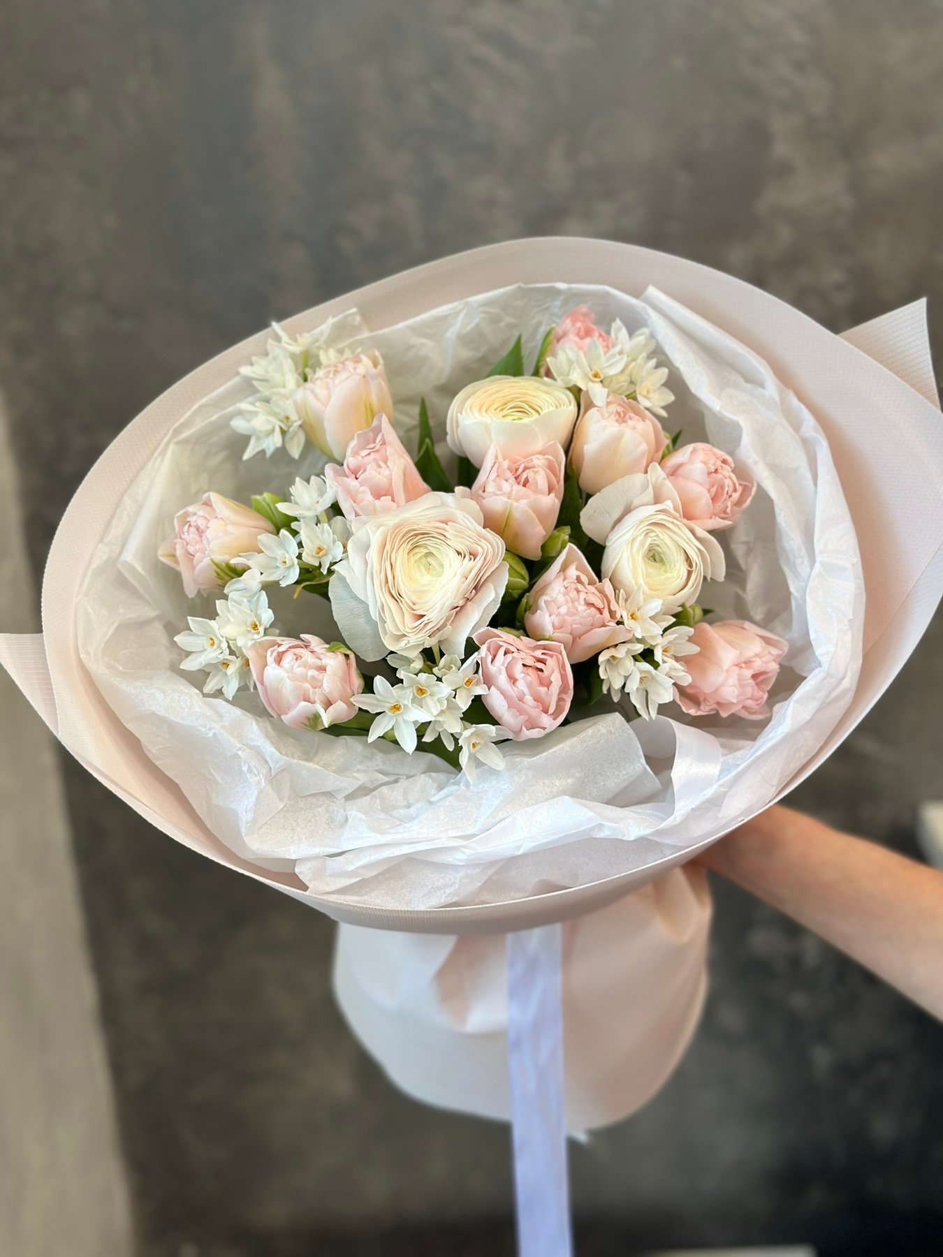 Букет з піоноподібними тюльпанами, нарцисами та ранункулюсами #112