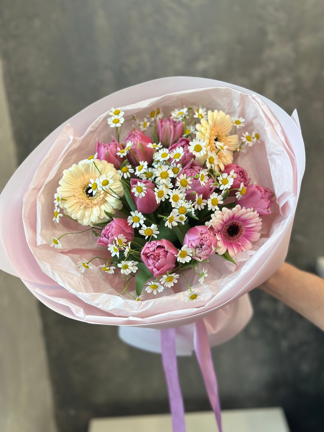 Весняний красунчик, підійде до будь-якого приводу, прикрашений елегантними стрічками та стильним упакуванням.