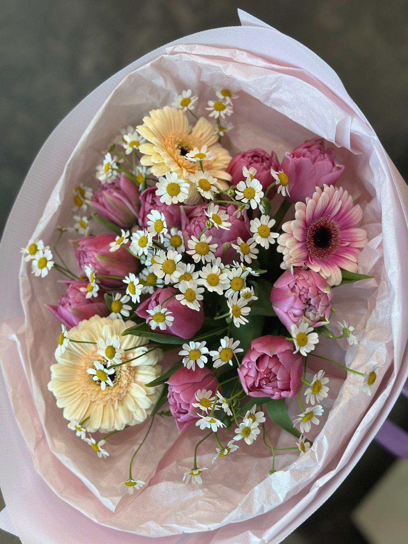Букет з піоноподібними тюльпанами, ромашками та герберами #113