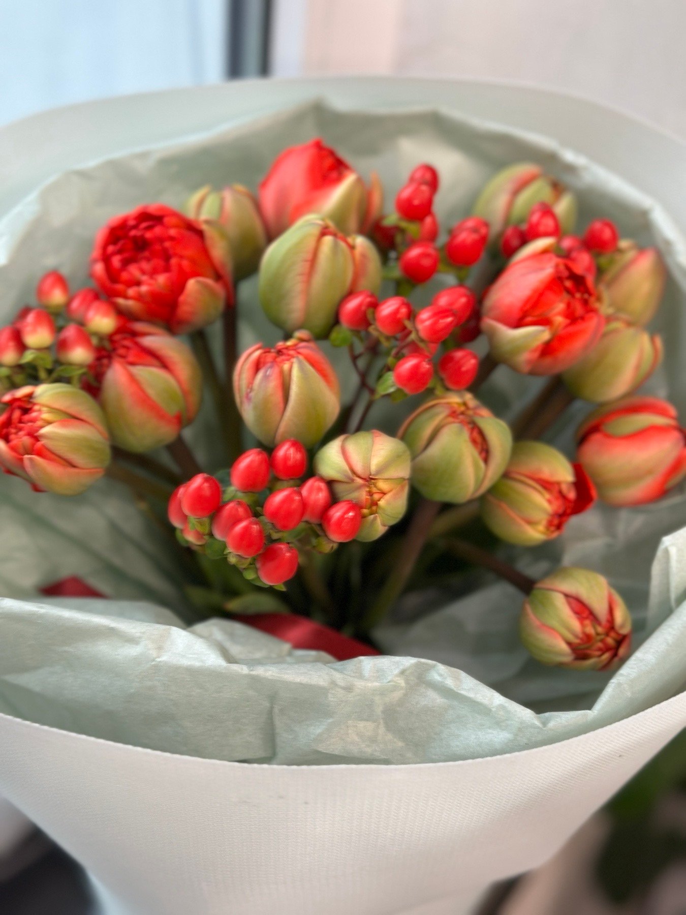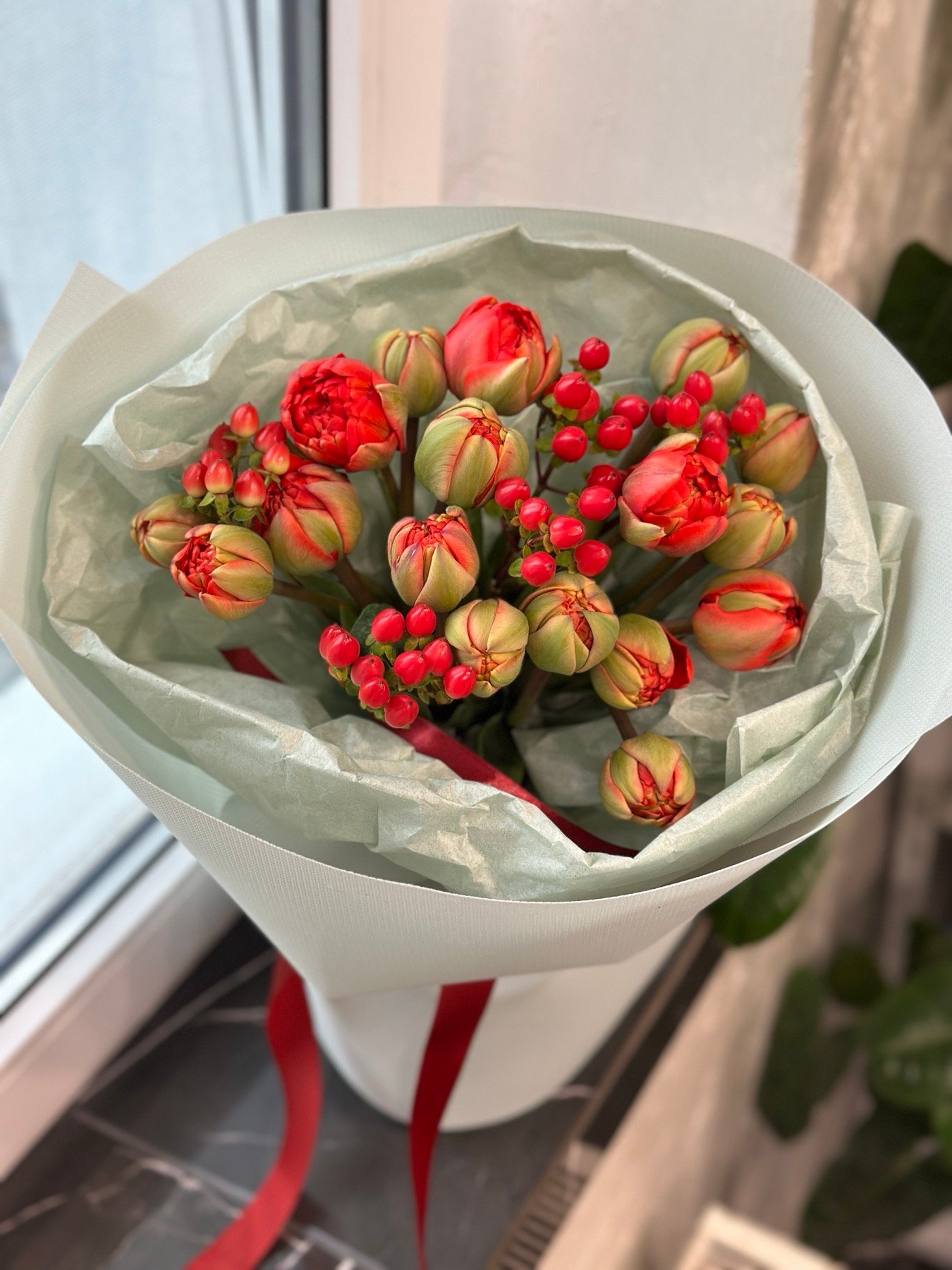 | Склад: | Тюльпани піоноподібні -17 шт, хіперікум 5 шт , упакування. |