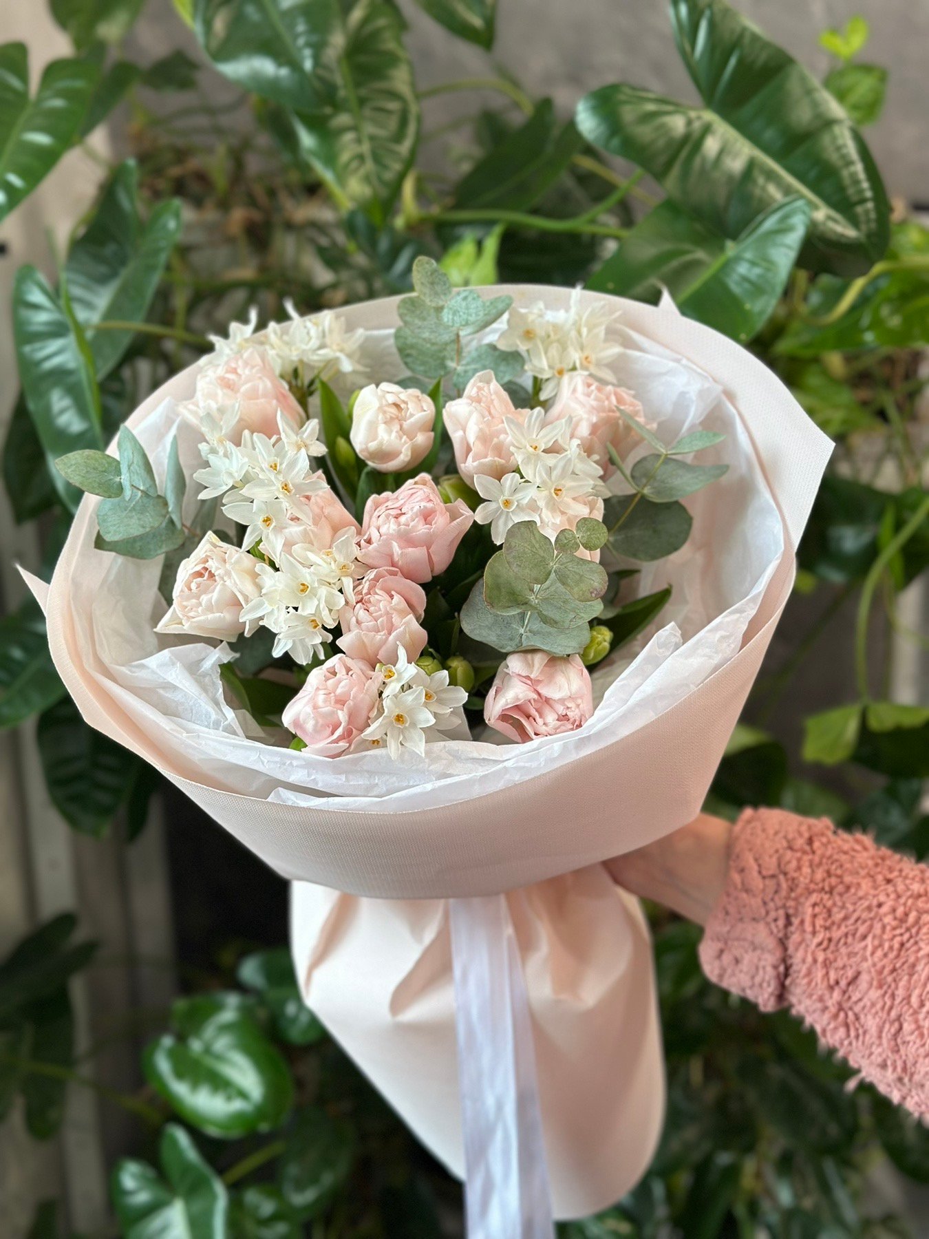 | Склад: | Піоноподібні тюльпани – 11 шт, нарцис Зіва – 6 шт, евкаліпт, упакування. |