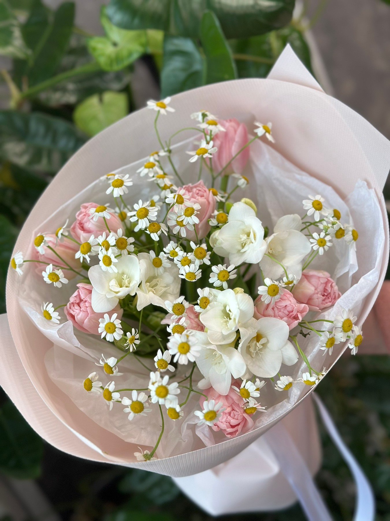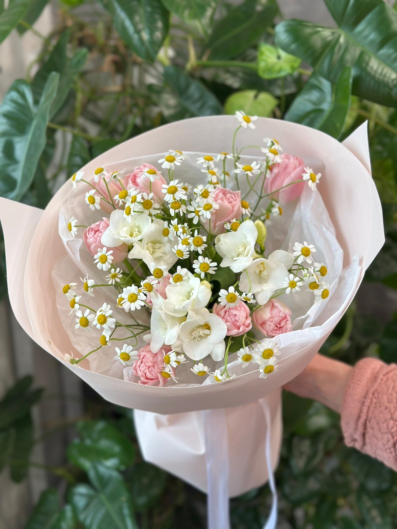 | Склад: | Тюльпани піоноподібні – 9 шт, ромашки/танацетум – 2 гілок, фрезія -3 шт, упакування. |