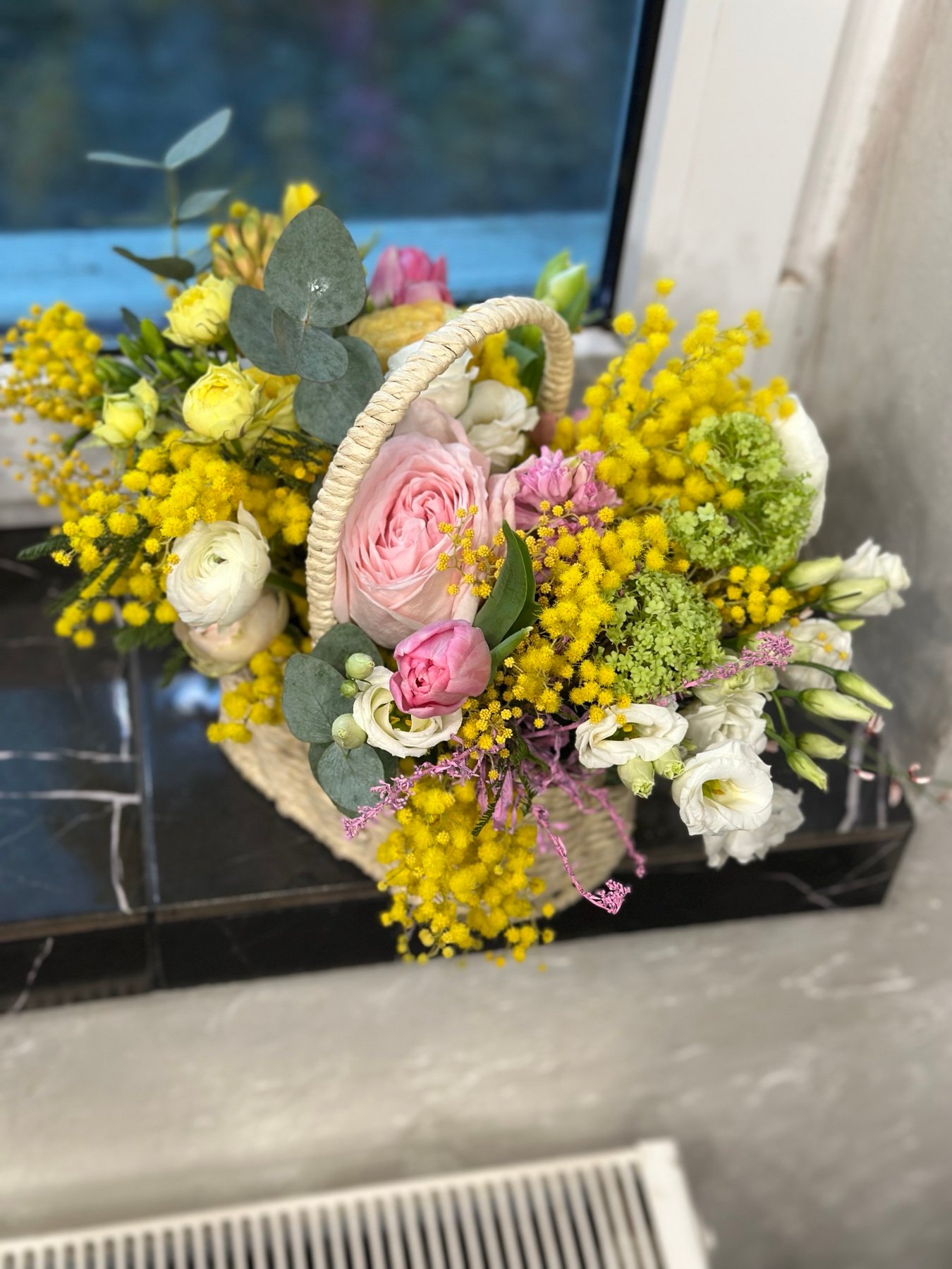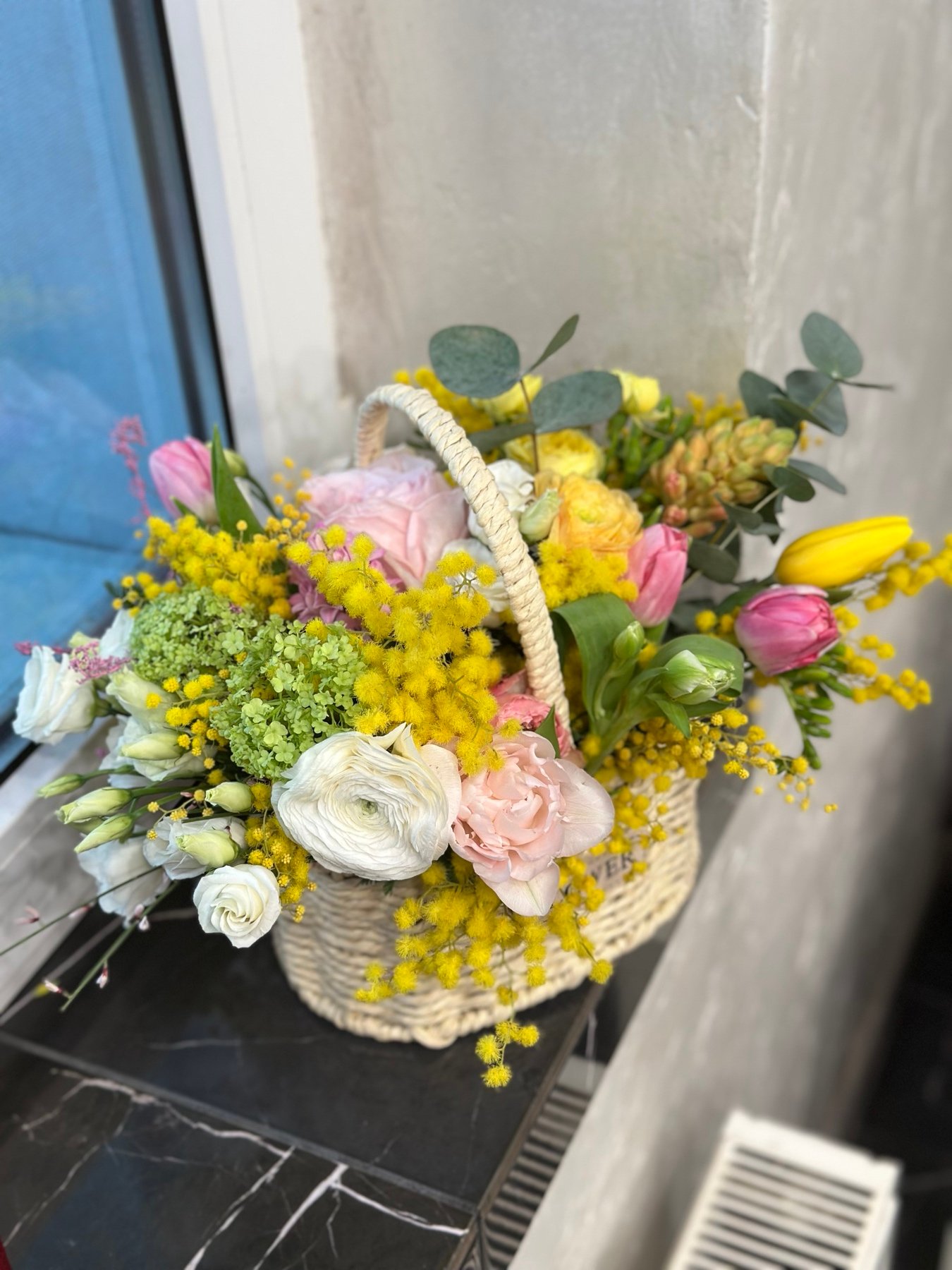 Квіткова композиція в корзині коробці з живих квітів, зроблена в спеціальній флористичній губці.